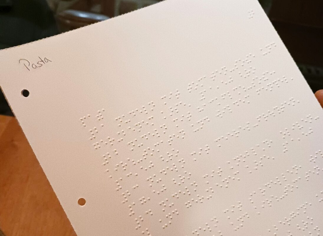 „Ich habe eine Mitarbeiterin der Stiftung gebeten, ob sie mir die Speisekarte in Blindenschrift drucken kann“, erzählt Infantone und zeigt auf das Ergebnis. Die dicken Papierbögen sind übersäht mit Punkten, die Menschen, die die Blindenschrift beherrschen, durch Abtasten ähnlich wie Buchstaben lesen können.