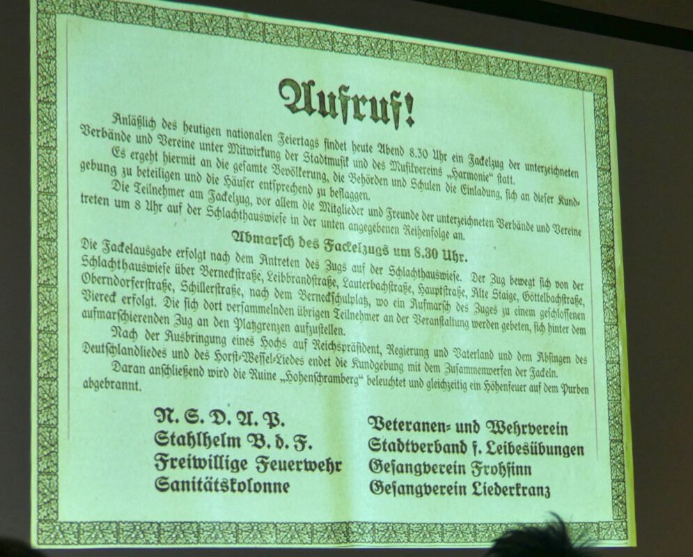 Mit der Machtübernahme durch die NSDAP im Januar 1933 endete bald auch das bisherige Vereinsleben. Im März unterschrieb auch der Stadtverband einen Aufruf zu einer großen Kundgebung für die neuen Herren. Auch die Feuerwehr, der Sanitätskolonne, die Gesangsvereine waren dabei. Die Sportvereine wurden gleichgeschaltet im NS-Reichsbund für Leibesübungen .