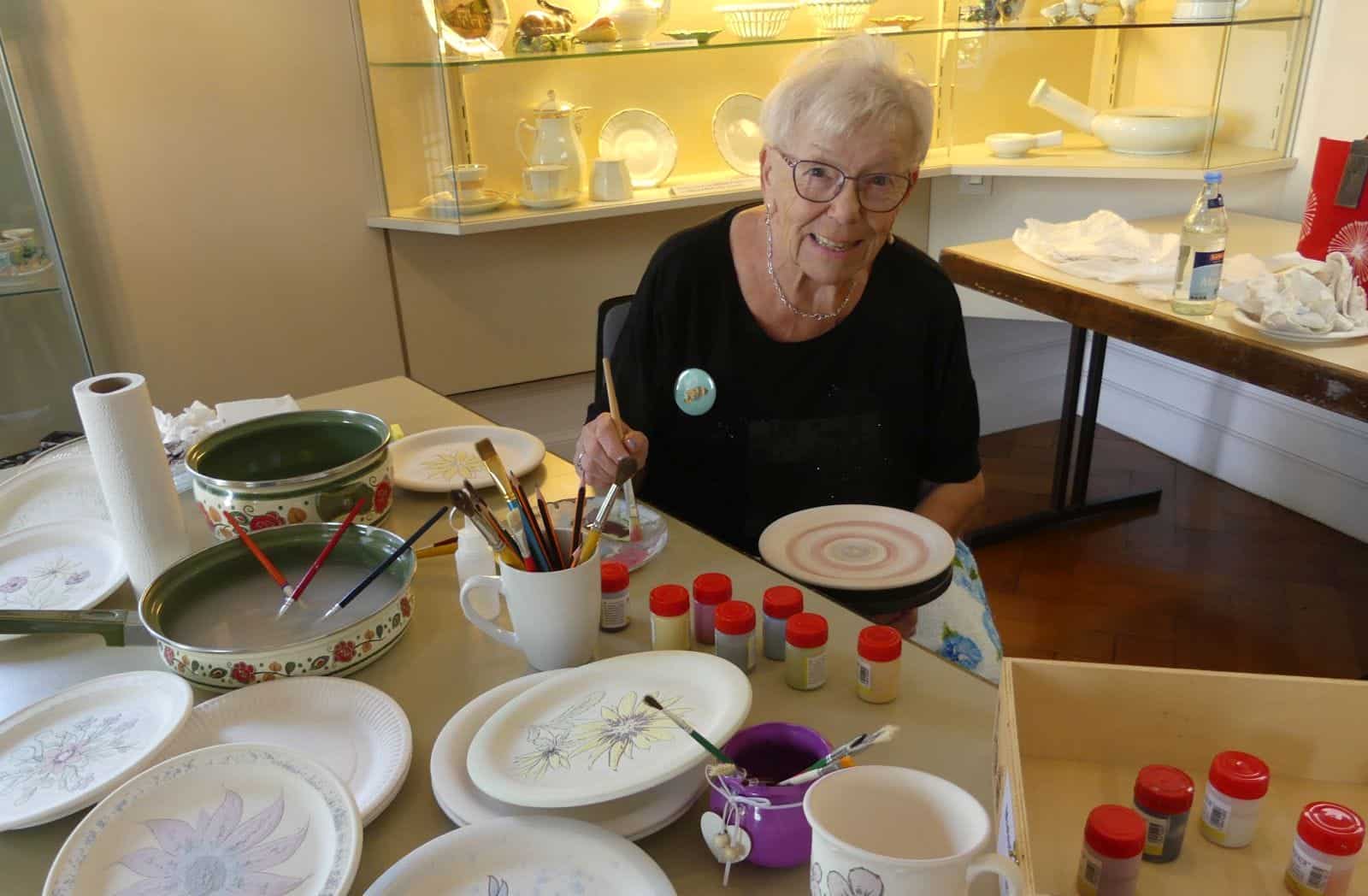 Im Museum hat sich Strohflechterin Barbara Reith ihren Arbeitsplatz in der Abteilung Strohflechten eingerichtet. Im Ausstellungstraum gegenüber bemalen Kinder mit ihren Eltern Porzellantassen. Im Gegensatz zu dieser „Aufglasmalerei“ zeigt Doris Gagg, wie zu Majolika-Zeiten Geschirr vor dem Glasieren bemalt und anschließend glasiert wurde.