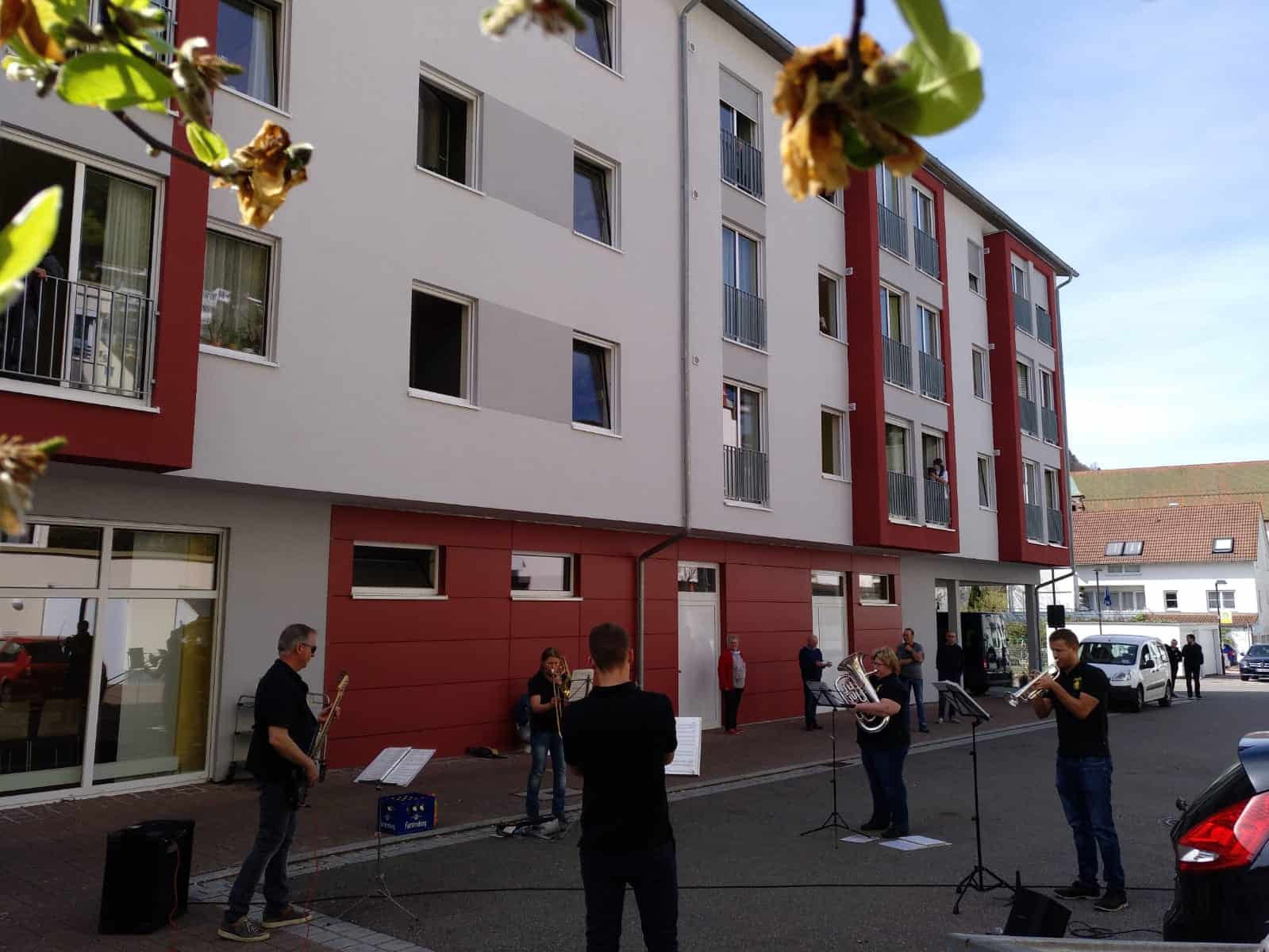 Neue Ideen in einer außergewöhnlichen Zeit: Die Stadtmusik Schramberg spielte am Mittwochnachmittag für die Bewohner des Spittelseniorenzentrums in der Schramberger Talstadt. Damit auch möglichst alle die Chance hatten von geöffneten Fenstern und Balkonen aus das Konzert zu verfolgen, hatten die Musiker die Josef-Andre-Straße als Konzertbühne gewählt.