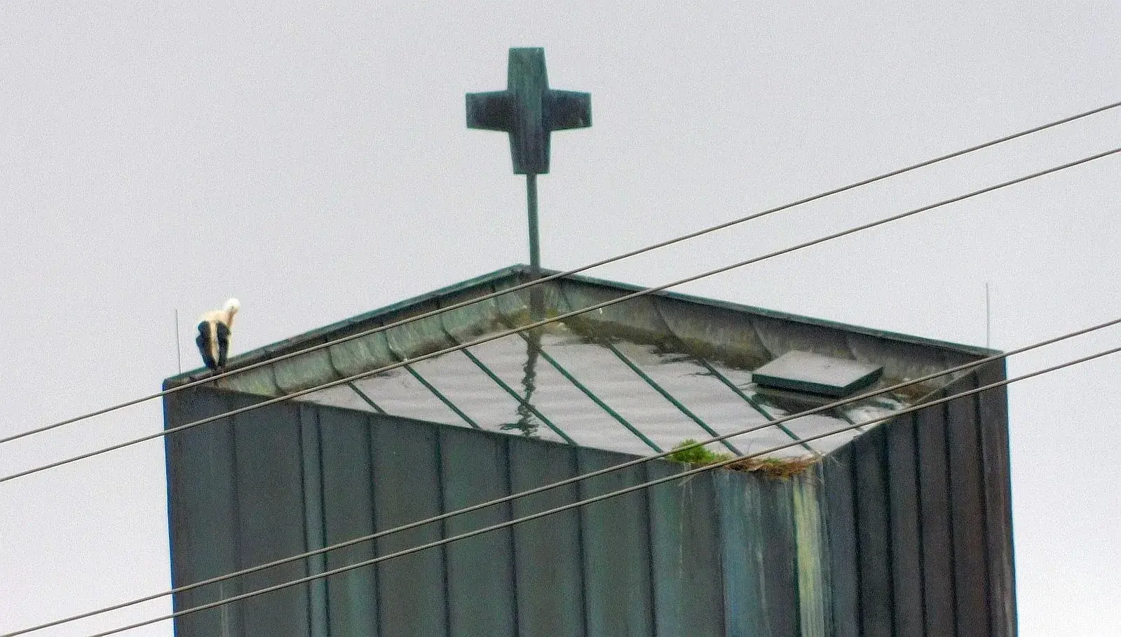 Letztes Jahr hatte bekanntlich schon mal ein Storchenpaar auf dem Kirchendach sein Nest gebaut und hat mehrere Küken ausgebrütet. Damals seien die Küken wohl erfroren oder im Nest ertrunken. Doch nun ist wieder ein Paar auf dem Blechdach aktiv.
