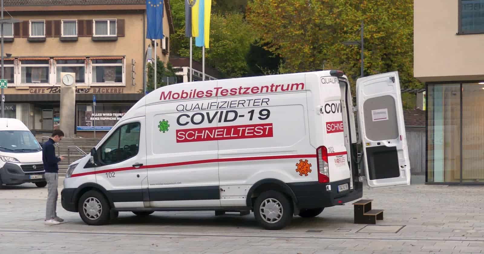 Am Donnerstagnachmittag bis zum Abend stand auf dem Rathausplatz zwischen Sparkasse und Rathaus ein weißer Lieferwagen. Aufschrift „Mobiles Testzentrum“. Angeboten werden „Qualifizierte Covid-19 Schnelltests“. Eine kleine Stufe erlaubte es, den Wagen leichter zu betreten.