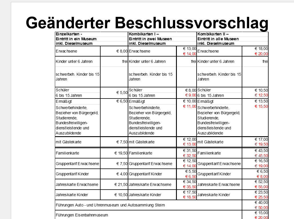 Im neuen Vorschlag steigen die Preise für die Kombikarten um 2,50 bis vier Euro, um dem größeren Mehrwert dieser Eintrittskarten Rechnung zu tragen. Das habe sich in einem weiteren Gespräch mit den Verantwortlichen der Autosammlung Steim herauskristallisiert.