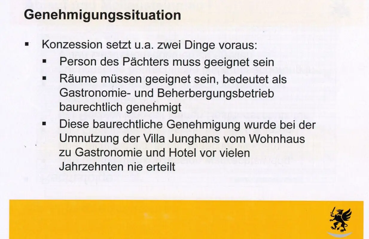 Jedenfalls hat die Stadt damals dennoch eine Gaststättenkonzession erteilt. In den Folgejahren galt deshalb für alle Betreiber Bestandsschutz. Heute aber könnte ein Pächter der Villa Junghans nicht mehr darauf pochen, weil die Villa jahrelang nicht genutzt wurde. Er müsste die Nutzungsänderung und eine Gastronutzung beantragen.