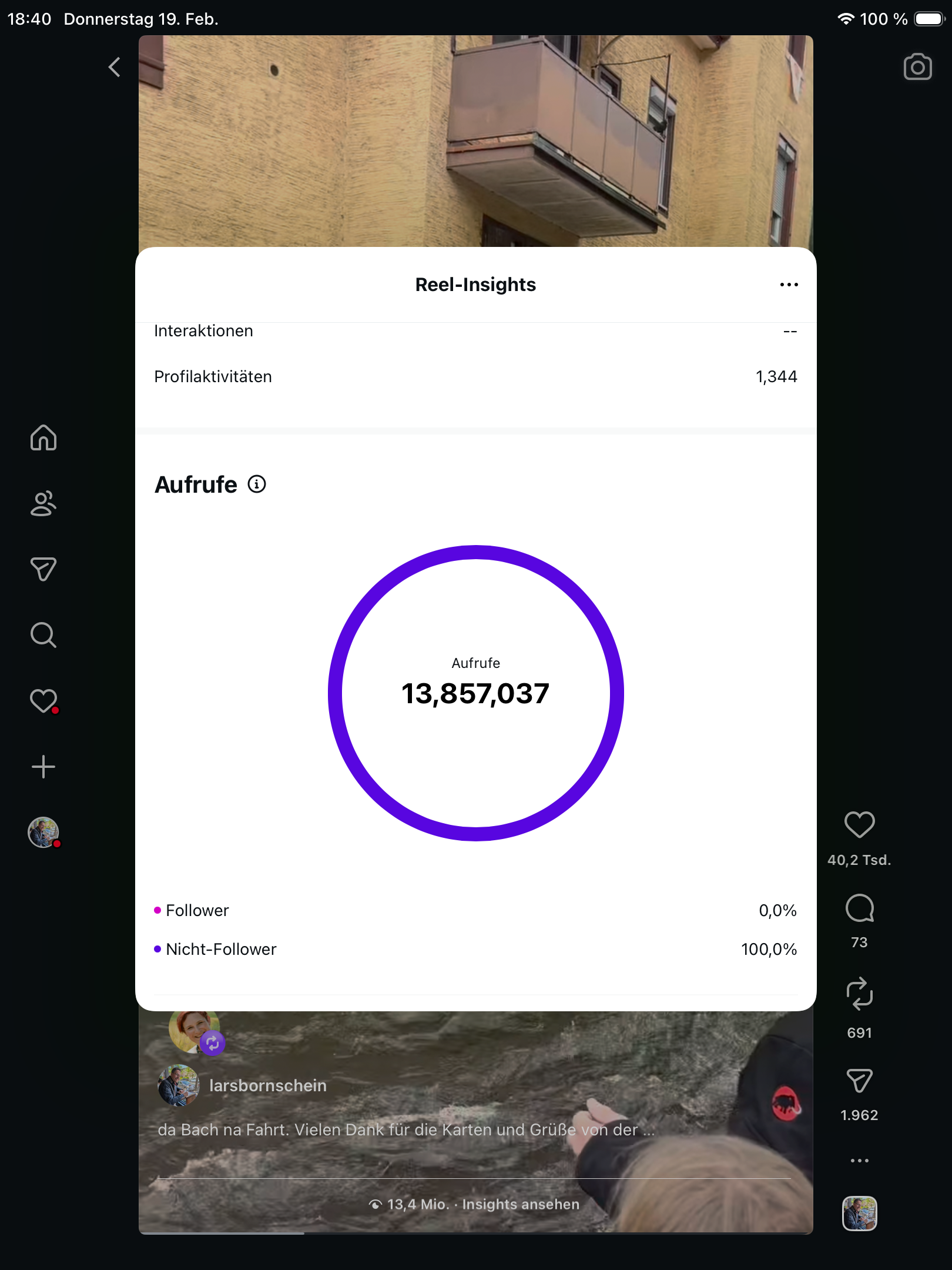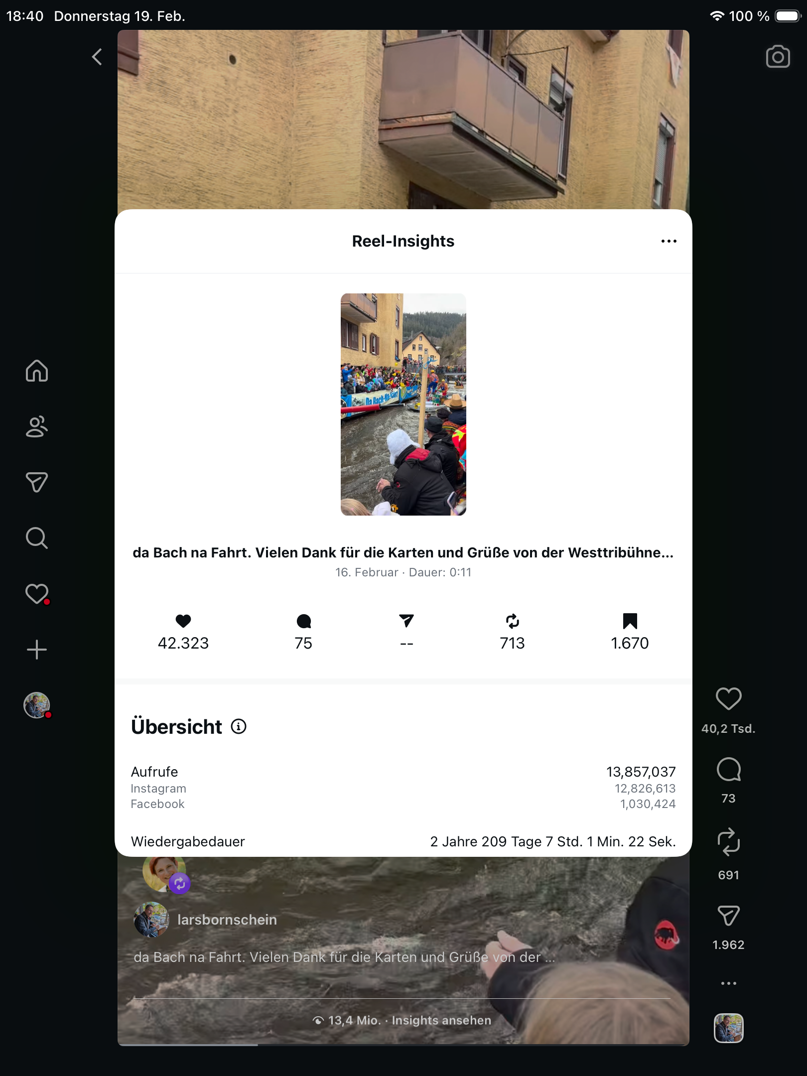 Wie bereits in den Jahren zuvor veröffentlichte Bornschein nach der Bach-na-Fahrt mehrere Clips auf Facebook und Instagram. Doch dieses eine Video entwickelte eine Eigendynamik, die sich auch Bornschein nicht erklären kann: Bereits am Abend der Veröffentlichung wurde es rund zwei Millionen Mal aufgerufen, inzwischen verzeichnet der Clip 13,4 Millionen Views. Das entspricht einer aufsummierten Abspielzeit von 2 Jahren und 209 Tagen. Fast 700-mal wurde er geteilt und über 42.000-mal mit „Gefällt mir“ markiert.