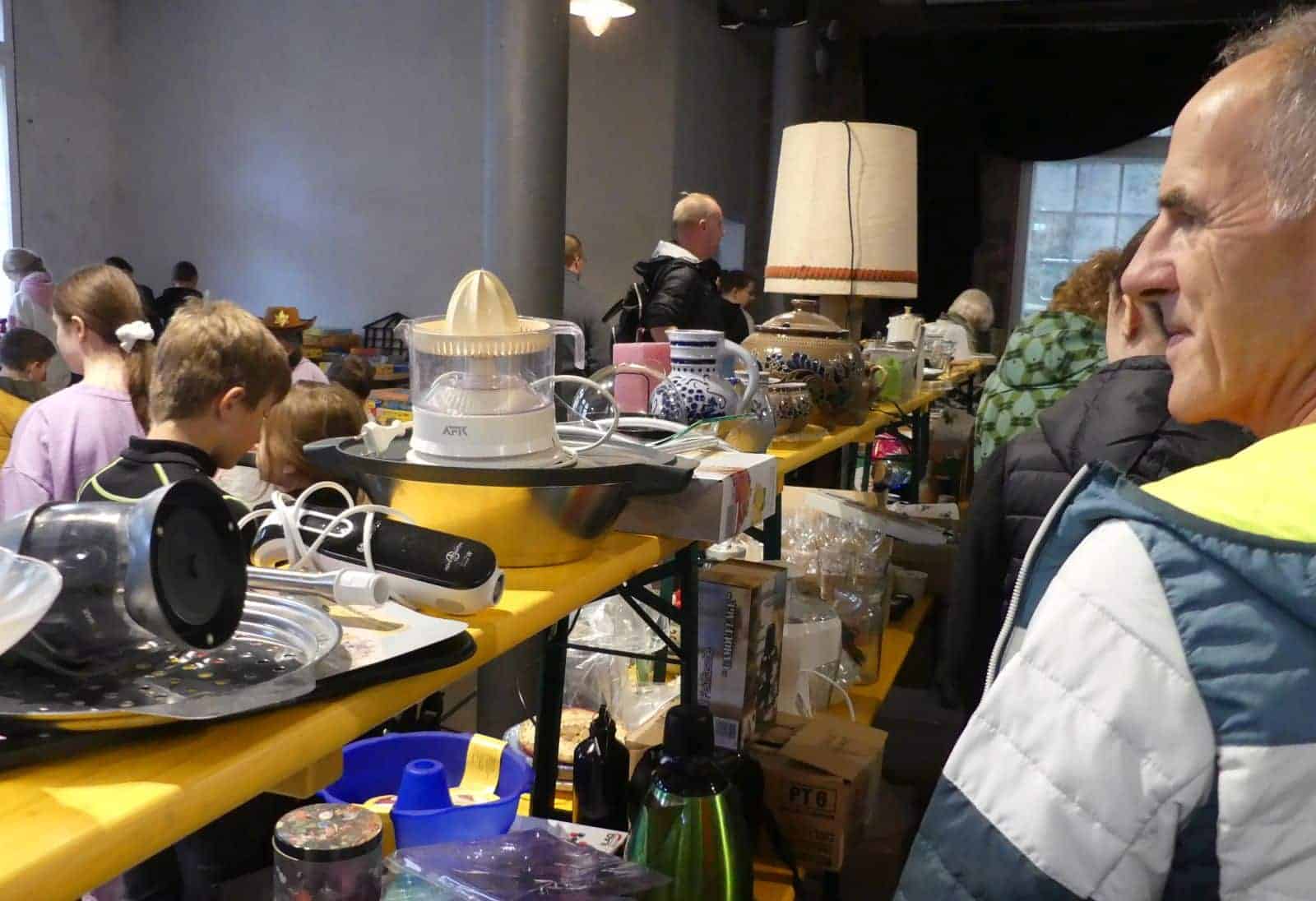 Das reicht von Kinderspielzeug und Kaffee-Geschirr, über Weingläser und Racletteöfchen bis hin zu Schleifmaschinen und Spazierstöcken. Eine große Menge Bücher wartet auf Liebhaber. Stereoanlagen, Kameras, Kleiderbügel und Handtaschen, alles fein säuberlich sortiert und auf den Biertischen drapiert.