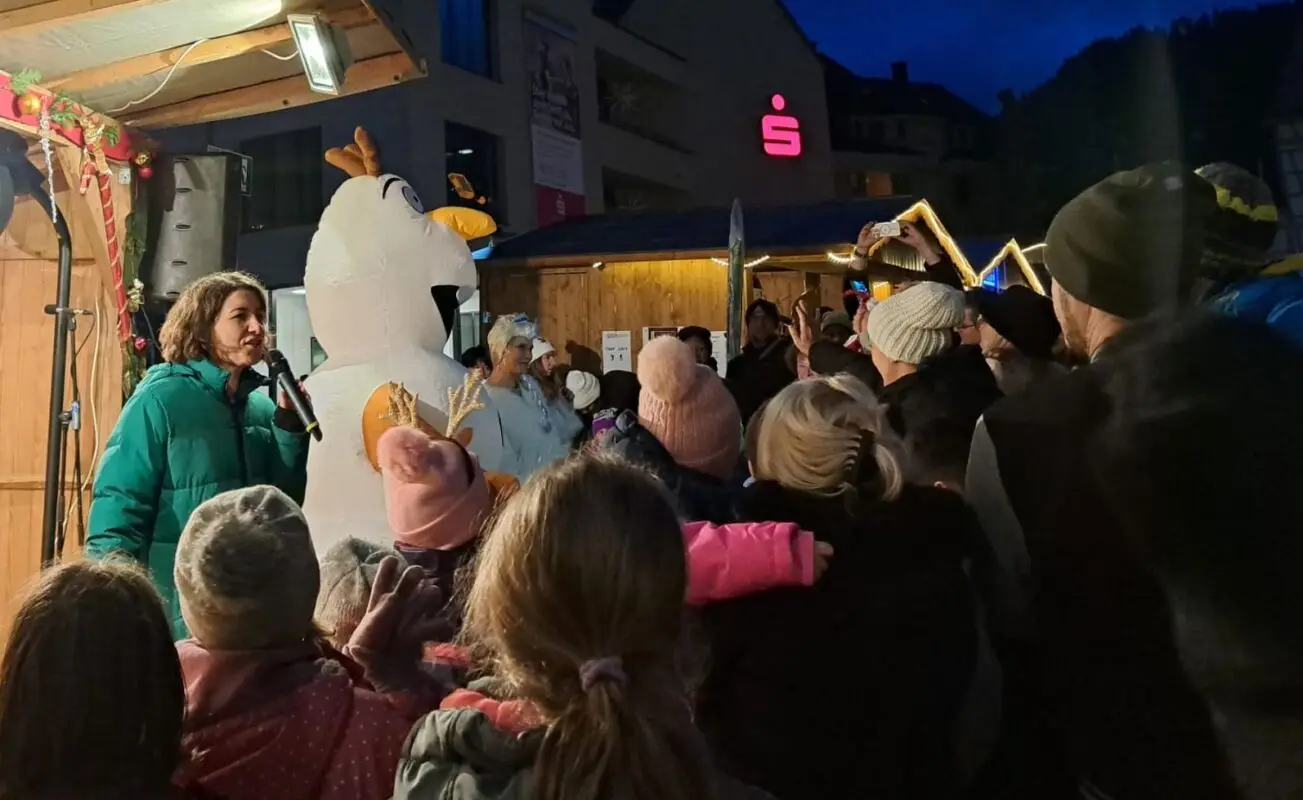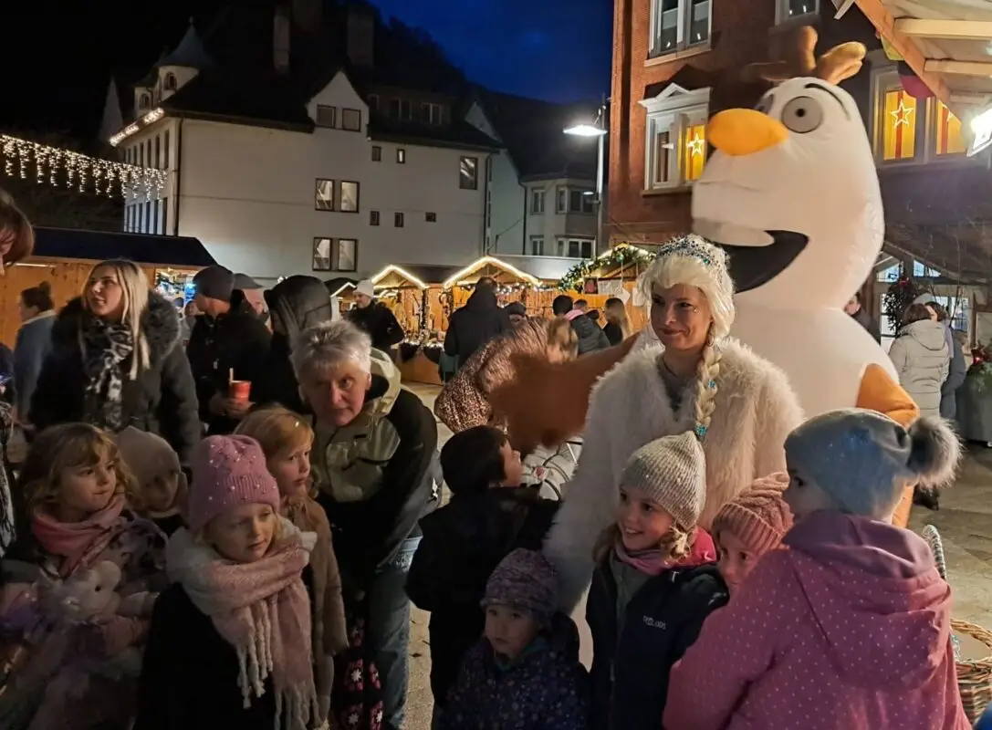 Pünktlich um 17 Uhr hat Schrambergs Oberbürgermeisterin Dorothee Eisenlohr am Freitag den diesjährigen Schramberger Weihnachtsmarkt eröffnet. Begleitet von „Olaf und Elsa“ aus der “Eisprinzessin“ und den „Türmlebläsern“ bedankte sie sich bei allen Beteiligten. Sie staunte ob des Andrangs von Kindern und Familien „So voll war es noch nie.“
