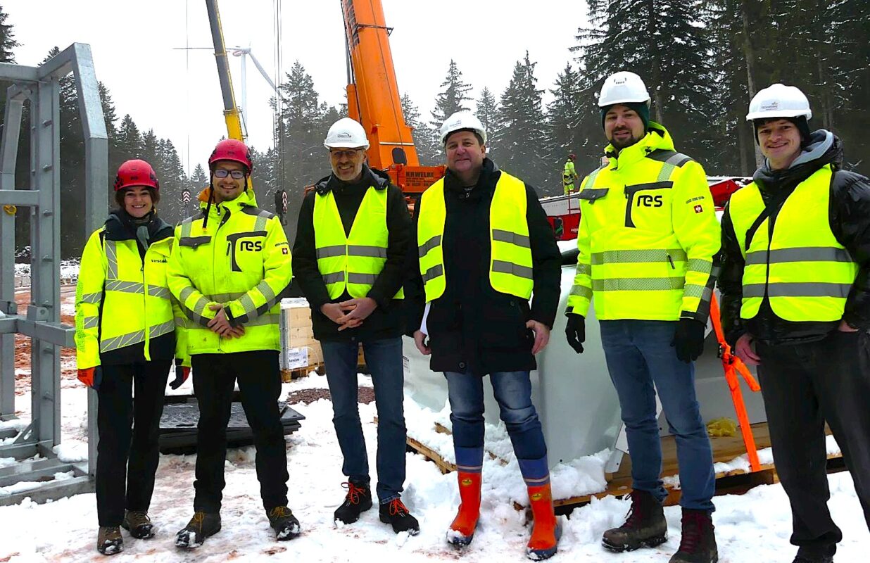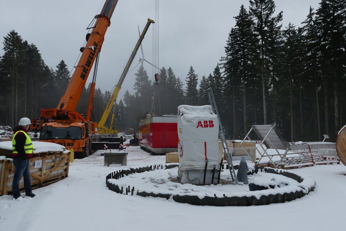 Schramberg/Hornberg. Ein nasskalter Winternachmittag. Ausgestattet mit Warnwesten, Sicherheitsschuhen und Schutzhelm stapfen einige Journalisten mit den Fachleuten Richtung Baustelle. Gekommen ist auch Hornbergs Bürgermeister Marc Winzer. Auf seiner Gemarkung wird die vierte Anlage gebaut. Neben uns drehen sich die drei seit 2021 bestehenden Anlagen leise im Höhenwind.
