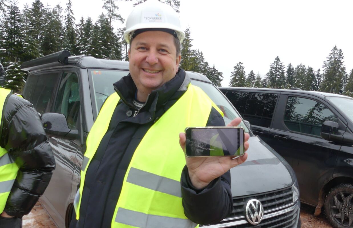Essig zieht sein Smartphone aus der Tasche, ein paar Wischer und er zeigt uns, was eine Kamera oben an der Gondel der Anlage gerade aufnimmt: Die Rotorblätter huschen vorbei. So kann das Team der Teckwerke von überall her beobachten, wie die Anlage läuft.