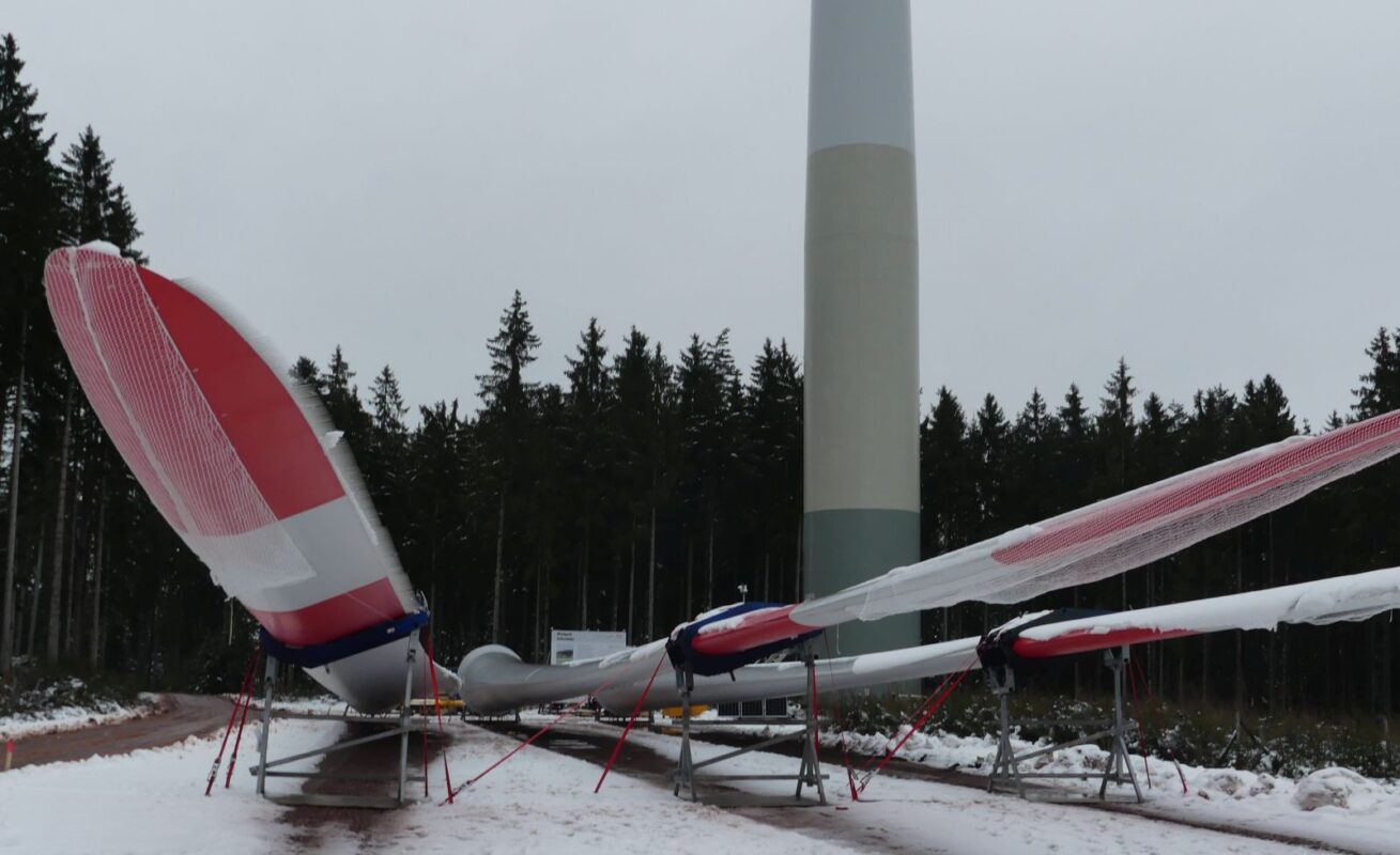 Drei 68 Meter lange Rotorblätter liegen bei einer der bestehenden Vestas-Anlagen bereit für die Montage. An den Kanten sind sie gezackt, das wird die Windgeräusche dämpfen. Sie liegen auf der frei gehaltenen Kranaufstellfläche der bestehenden Anlage Nummer 2. Ringsum wachsen die frisch angepflanzten Bäumchen in die Höhe.