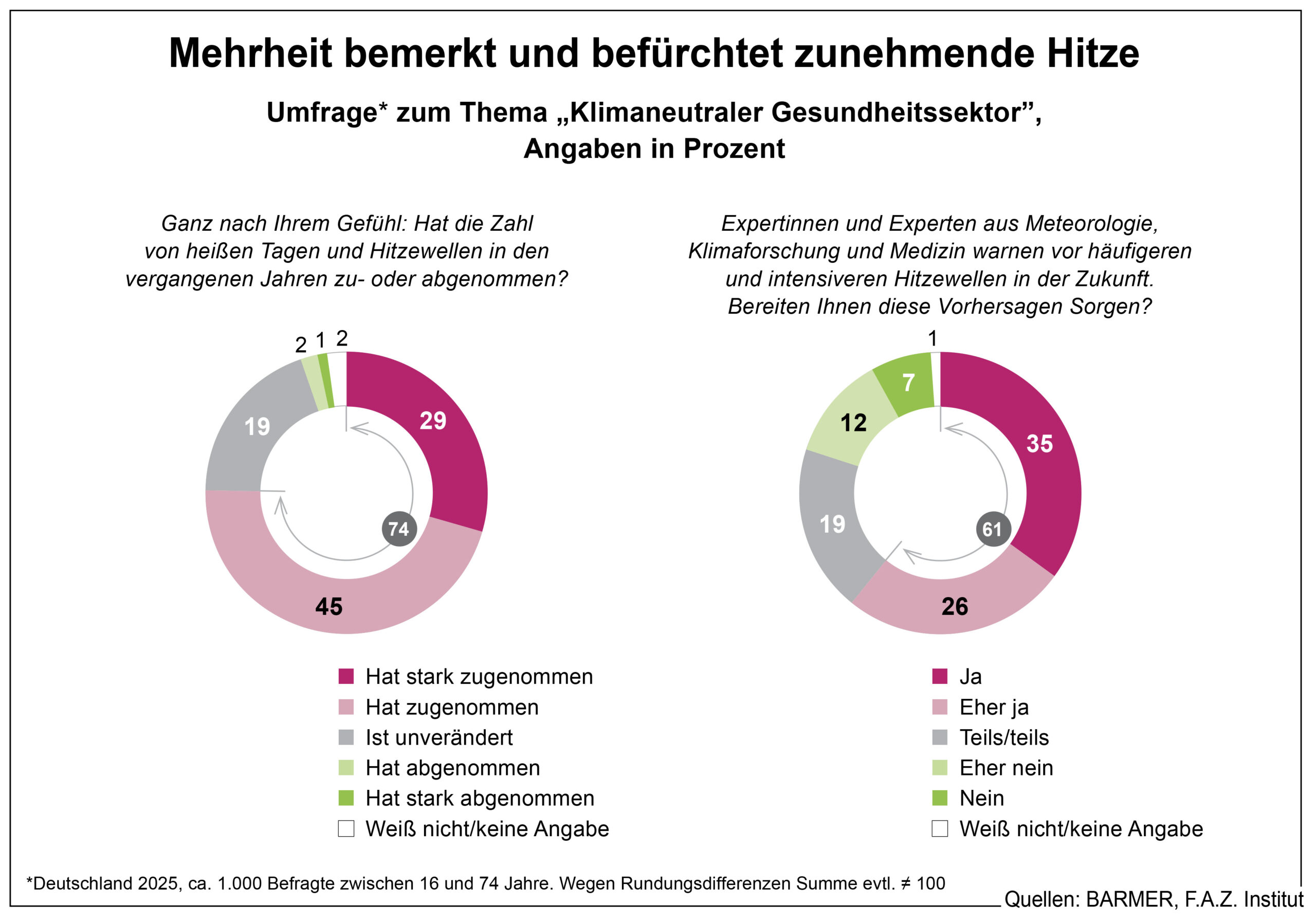 Das geht aus der repräsentativen Umfrage „Klimaneutraler Gesundheitssektor 2025“ der BARMER in Kooperation mit dem F.A.Z. Institut hervor. Von den 1000 Befragten zwischen 16 und 74 Jahren halten sich 79 Prozent über die gesundheitlichen Auswirkungen von Hitze für informiert, 73 Prozent nehmen amtliche Hitzewarnungen ernst.