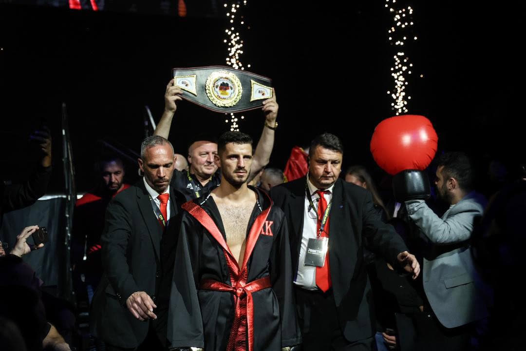 An vorderster Front stand Ardian Krasniqi. Der 28-Jährige sorgte am Samstagabend für Furore. Im Hauptkampf gegen Saul Ivan Male aus Uganda machte Krasniqi kurzen Prozess – zwei Minuten und 50 Sekunden durch eine Links-Rechts-Kombination zum Kinn des Afrikaners, der nach dem Einschlag der rechten Hand schwer zu Boden ging. Noch bevor der erfahrene Berliner Ringrichter Oliver Brien den Kampf vollständig auszählen konnte, beendete er ihn sofort. Male blieb am Boden, während die mit über 3000 boxbegeisterten Fans gefüllte Arena vor Begeisterung bebte.