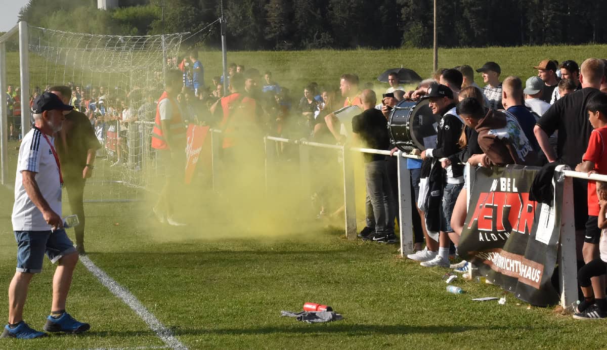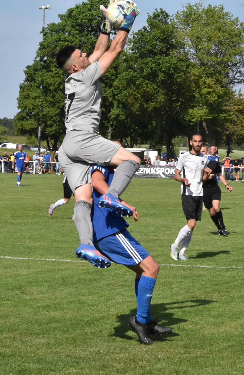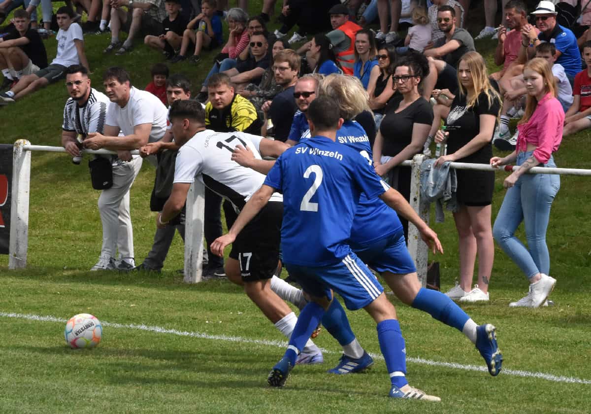 Die Kulisse beeindruckend, die Fans in Stimmung, die Sonne am Himmel – beste Voraussetzungen also für ein tolles Spiel. Und das gab es über weite Strecken auch. Zumal die Sulgener und Schramberger los legten wie die Feuerwehr – so musste sich Winzelns Tormann Ron Armbruster nach einem Fernschuss von Benjamin Staiger strecken, um ihn zu entschärfen (9. Minute). Die Winzelner wurden in die Defensive gedrängt und kamen immer wieder zu Kontern. So rettete Schramberg/Sulgens Torhüter Ion-Daniel Radu in höchster Not nach einem Schuss ins rechte untere Eck. Und auch der erste Treffer fiel nach einem Konter, der fast schon schulbuchmäßig über drei Stationen nach vorn ging. Der eingewechselte Max Finkbeiner voll (blau gekleidet, natürlich).