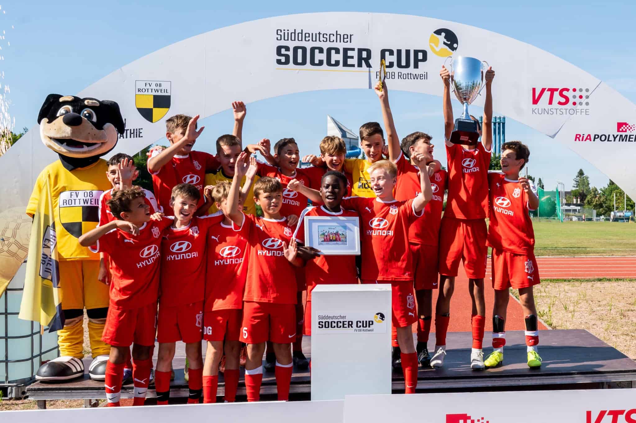 Rottweil. Am 16. und 17. Juli fand in Rottweil der Süddeutsche Soccer Cup statt. Angereist waren sieben süddeutsche Top-Teams der Altersklasse U15 und sieben Mannschaften des Jahrgangs 2009 und jünger. Ein Hauch von Champions League lag in der Luft, als bei der C-Jugend der Spielführer vom FV Ravensburg den Wanderpokal in die Luft streckte und die Glitzerstreifen des Feuerwerks auf das Team niederrieselten.