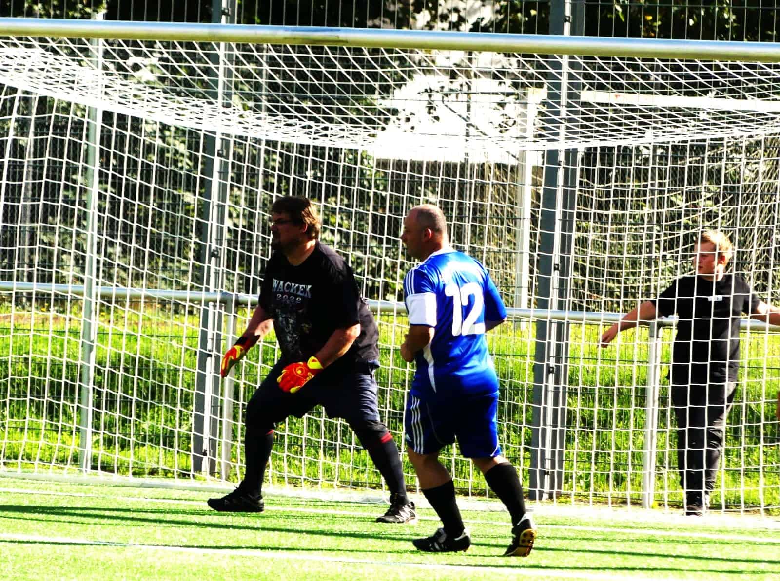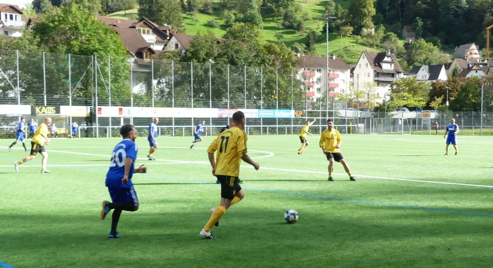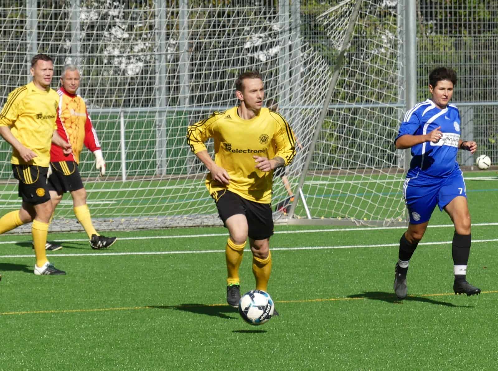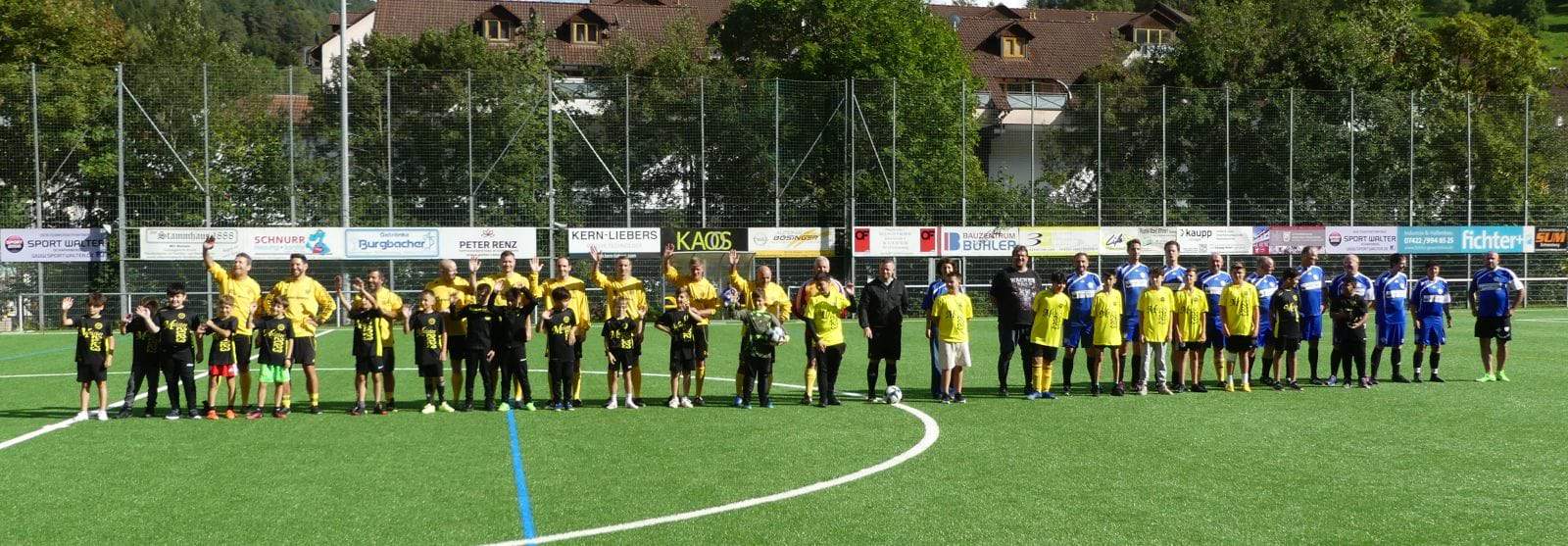 Und dann rollte der Ball. Die in gelben Trikots aufgelaufenen All Stars schossen gleich in den ersten Minuten drei Tore, die Hilmar Bühler auch mit großer Körperfläche nicht verhindern konnte.