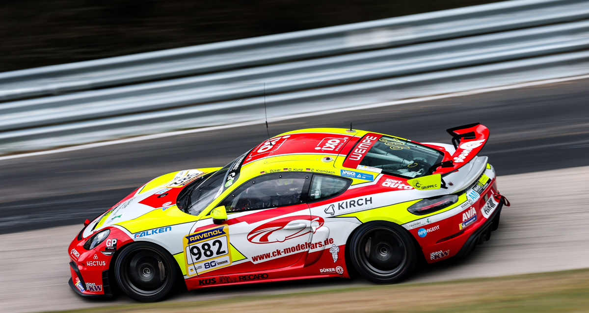 Schon im Zeittraining am frühen Samstagmorgen konnte Lion Düker die erste Duftmarke auf der Nürburgring-Nordschleife (24 km) setzen und den Porsche #982 auf den dritten Platz in der Am-Wertung der Cup3-Klasse platzieren. Vor einer Kulisse mit über 25.000 Zuschauern übernahm C.K. den Start für das erste Drittel der Distanz von vier Stunden. Für den zweiten Stint nach dem Fahrerwechsel übernahm Lion Düker das Cockpit. Er hatte trotz einiger Code-60 Phasen eine gute Pace und konnte wertvolle Plätze herausfahren. Etwa bei Halbzeit erlebte er im Streckenabschnitt Wippermann einen echten Schreckmoment. ,,Ich wurde Opfer einer Flüssigkeitsspur und konnte das Fahrzeug mit aller Mühe und Not vor einem harten Einschlag in die Streckenbegrenzung bewahren“, berichtete Düker. Mit ein paar leichten Schleifspuren an der Seite übergab Düker dann zum letzten Stint die #982 an seinen Teamkollege O.K. Der führte nach einem hart umkämpften Rennen, in dem es darum ging, das bestmögliche Traffic-Management zu betreiben, den Porsche nach vier Stunden auf einem starken dritten Platz sicher ins Ziel.