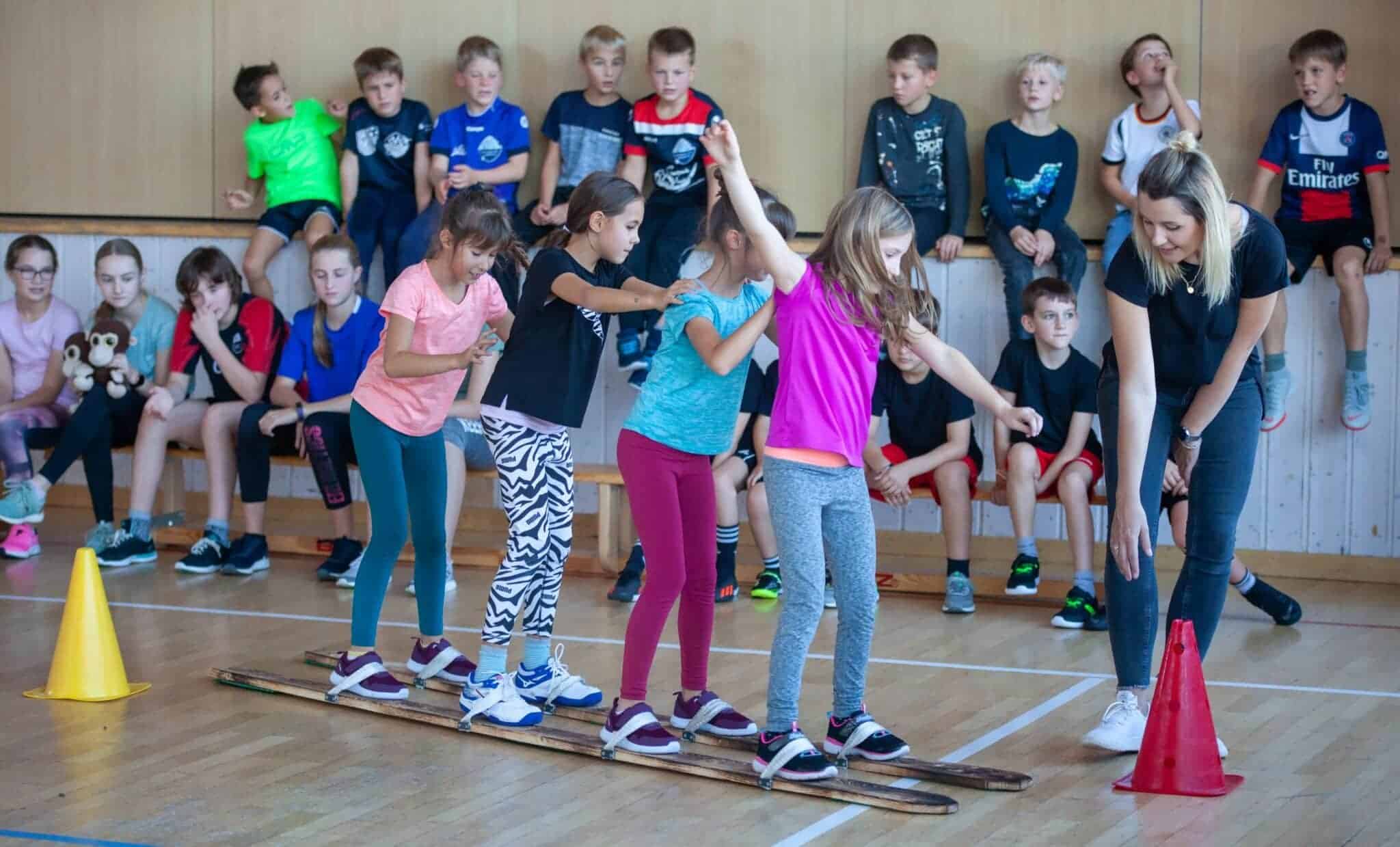 Aus dem angesagten Kinder-Biathlon entwickelte sich jedoch ein Sechs-Stationen-Wettkampf, bestehend aus „An einer Eisenstange die Schraube runterdrehen“, „Zielwerfen mit Tennisbällen“, „auf zwei langen Skiern als Team eine Slalomstrecke durchschieben“,“mit einem Besen und Holzklötzchen Eisstock schießen“, „Pedalo treten über eine Strecke von 20 Meter mit Wendepunkt“ und zuletzt „als Gruppe gemeinsam auf eine große Weichbodenmitte springen und diese an die Sprossenwand schieben.“
