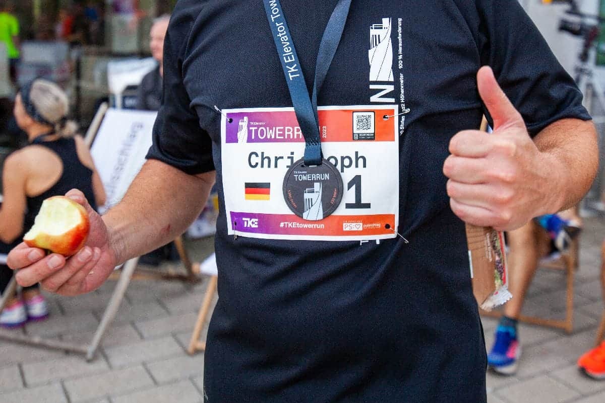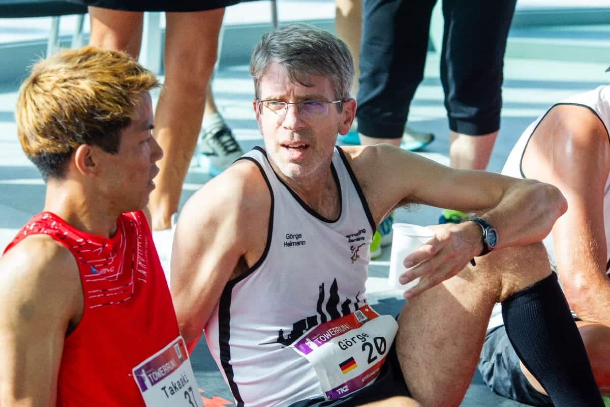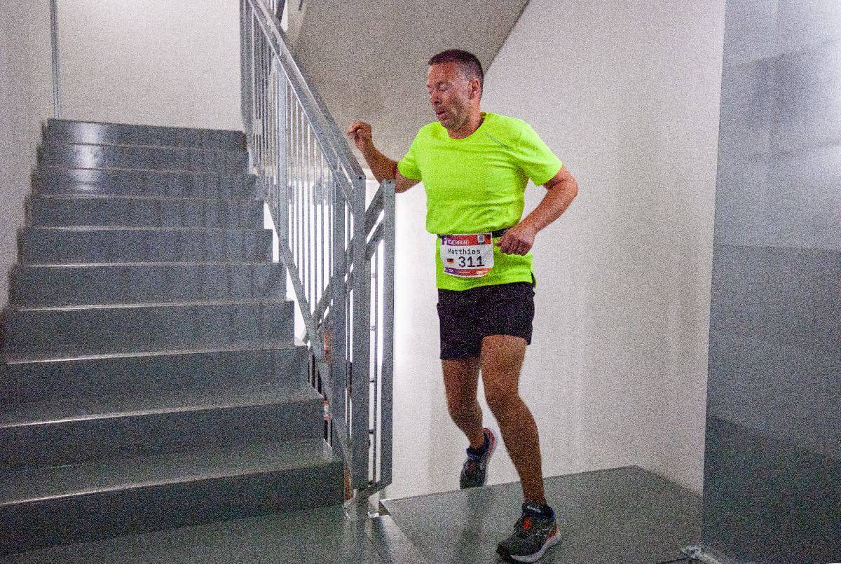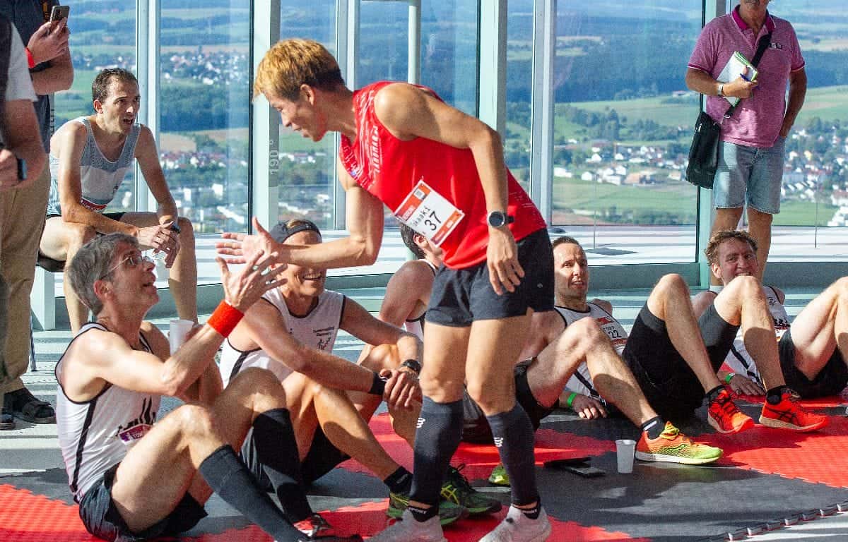 Spannung versprach der Kampf um den vertikalen Sieg der Topläufer. Christian Riedl vom Team Towerrunning Germany wurde einmal mehr seiner Favoritenrolle gerecht und wiederholte seinen Sieg aus dem Vorjahr. Der Streckenrekordhalter aus Erlangen siegte in einem Fotofinish in einer Zeit von 7:08 Minuten. Denn Zweiter mit nur einer Sekunde Rückstand wurde der Japaner Ryoji Watanabe (7:09 Min.). Auf Rang drei kämpfte sich der amtierende Deutsche Treppenlauf-Meister Andreas Fruhmann (Towerrunning Germany / 8:10 Min.) aus Leverkusen.