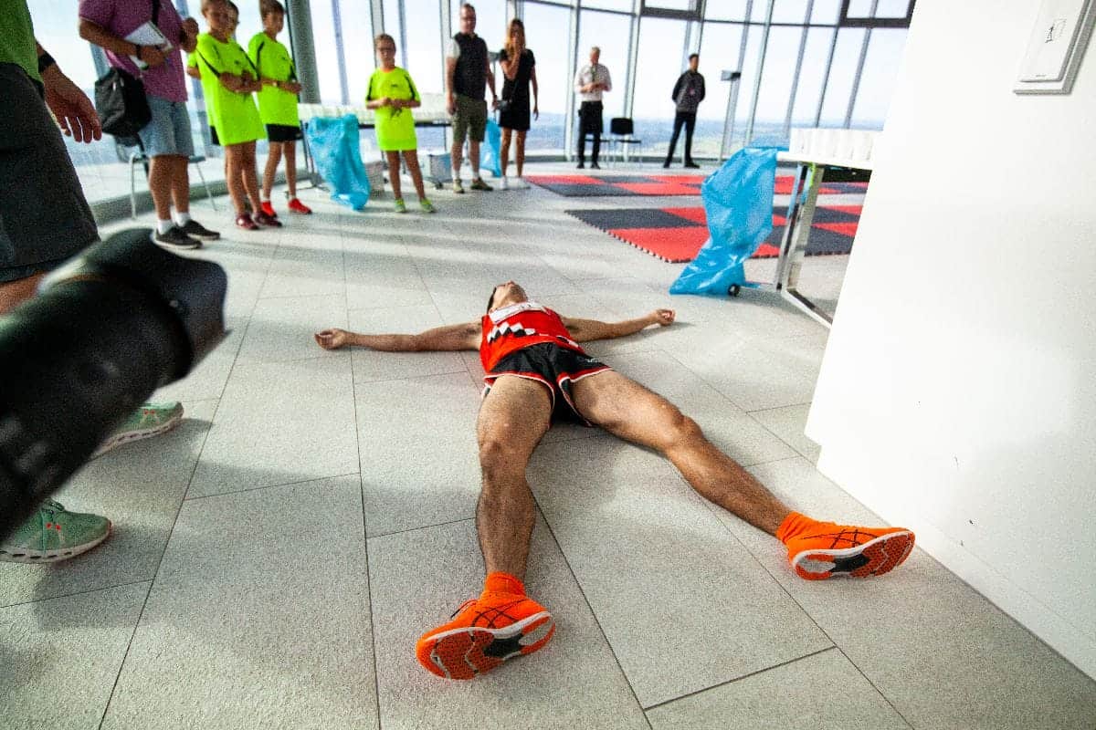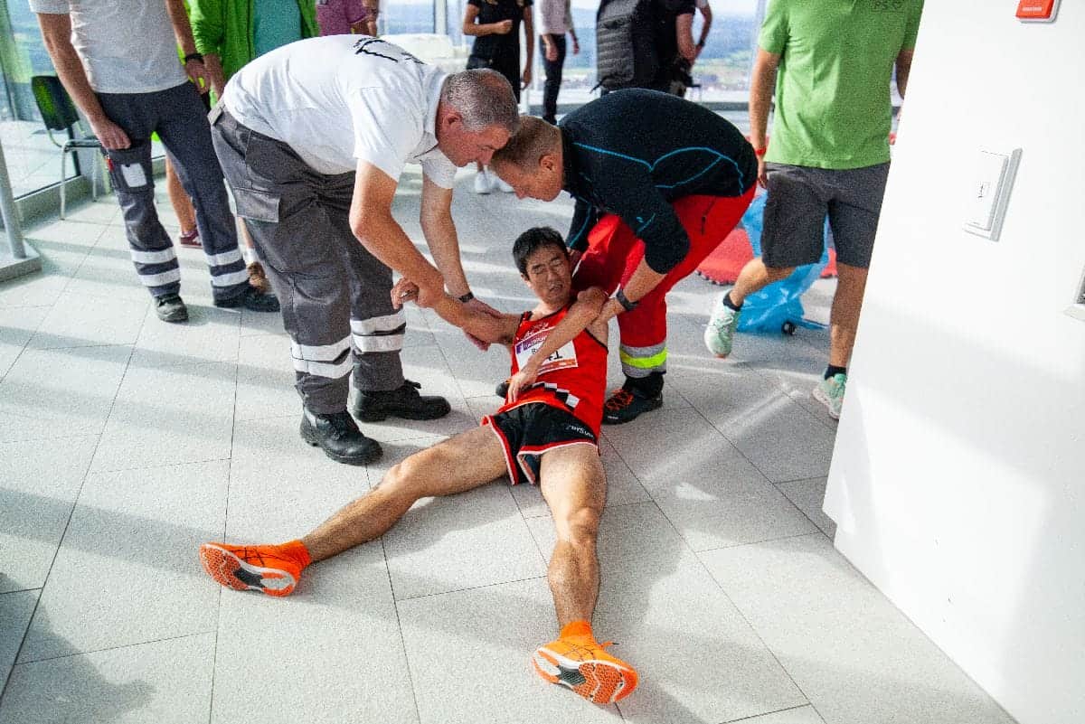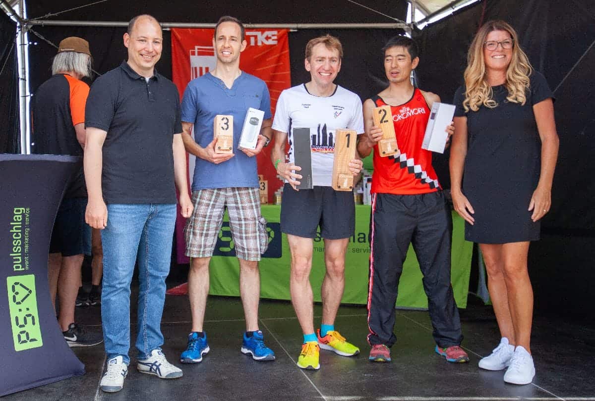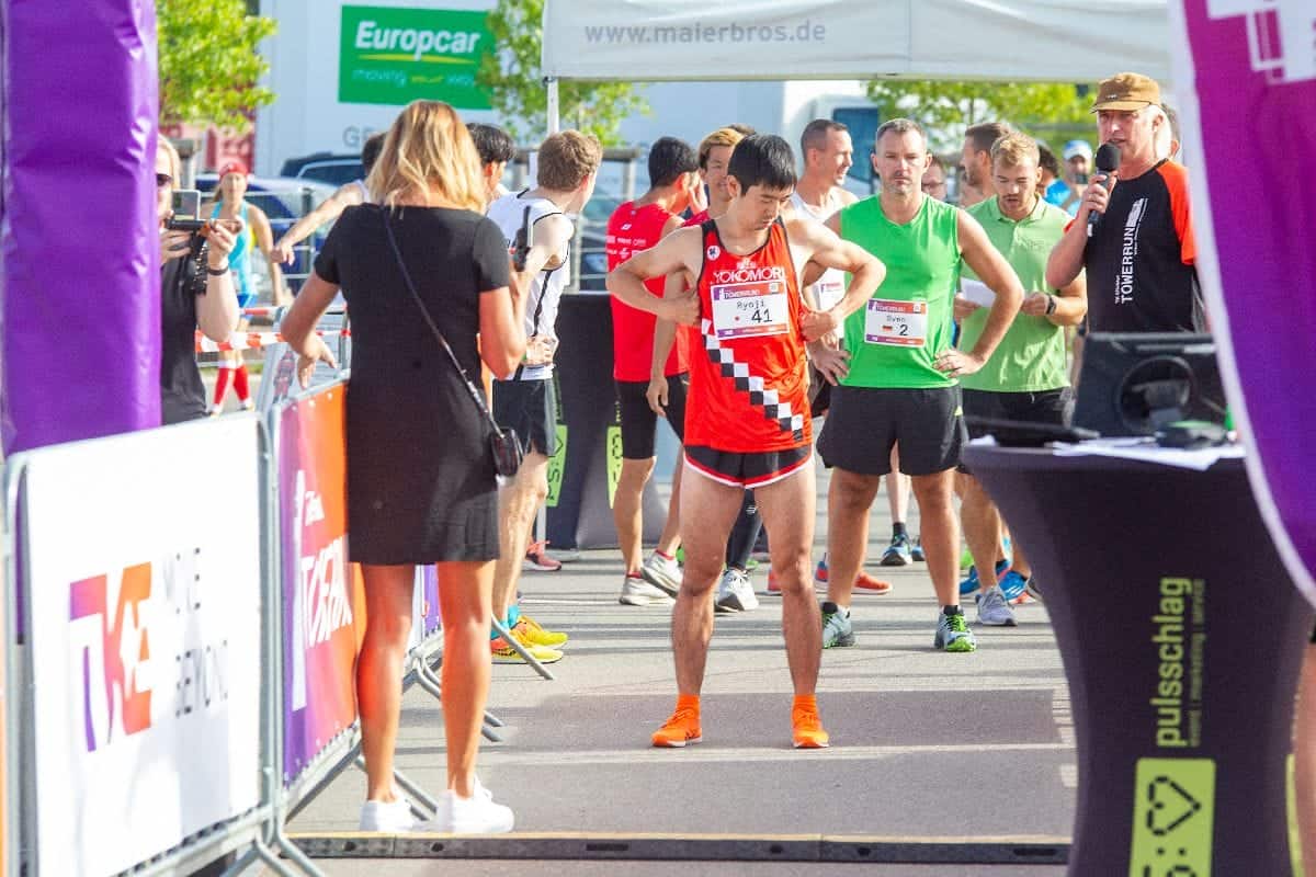 Spannung versprach der Kampf um den vertikalen Sieg der Topläufer. Christian Riedl vom Team Towerrunning Germany wurde einmal mehr seiner Favoritenrolle gerecht und wiederholte seinen Sieg aus dem Vorjahr. Der Streckenrekordhalter aus Erlangen siegte in einem Fotofinish in einer Zeit von 7:08 Minuten. Denn Zweiter mit nur einer Sekunde Rückstand wurde der Japaner Ryoji Watanabe (7:09 Min.). Auf Rang drei kämpfte sich der amtierende Deutsche Treppenlauf-Meister Andreas Fruhmann (Towerrunning Germany / 8:10 Min.) aus Leverkusen.