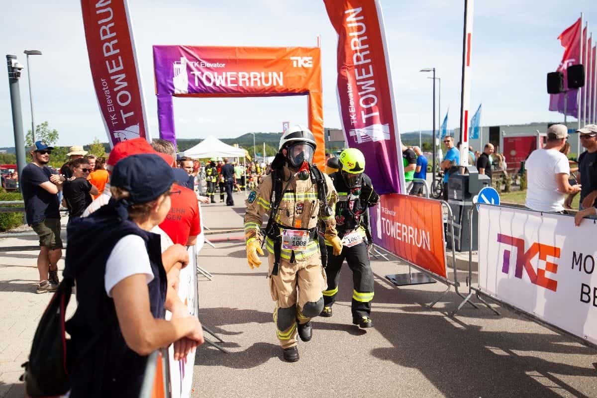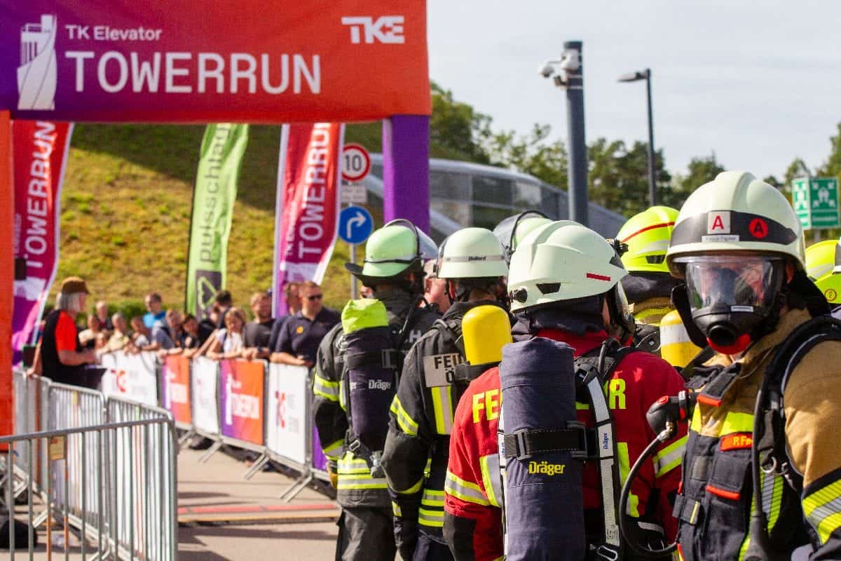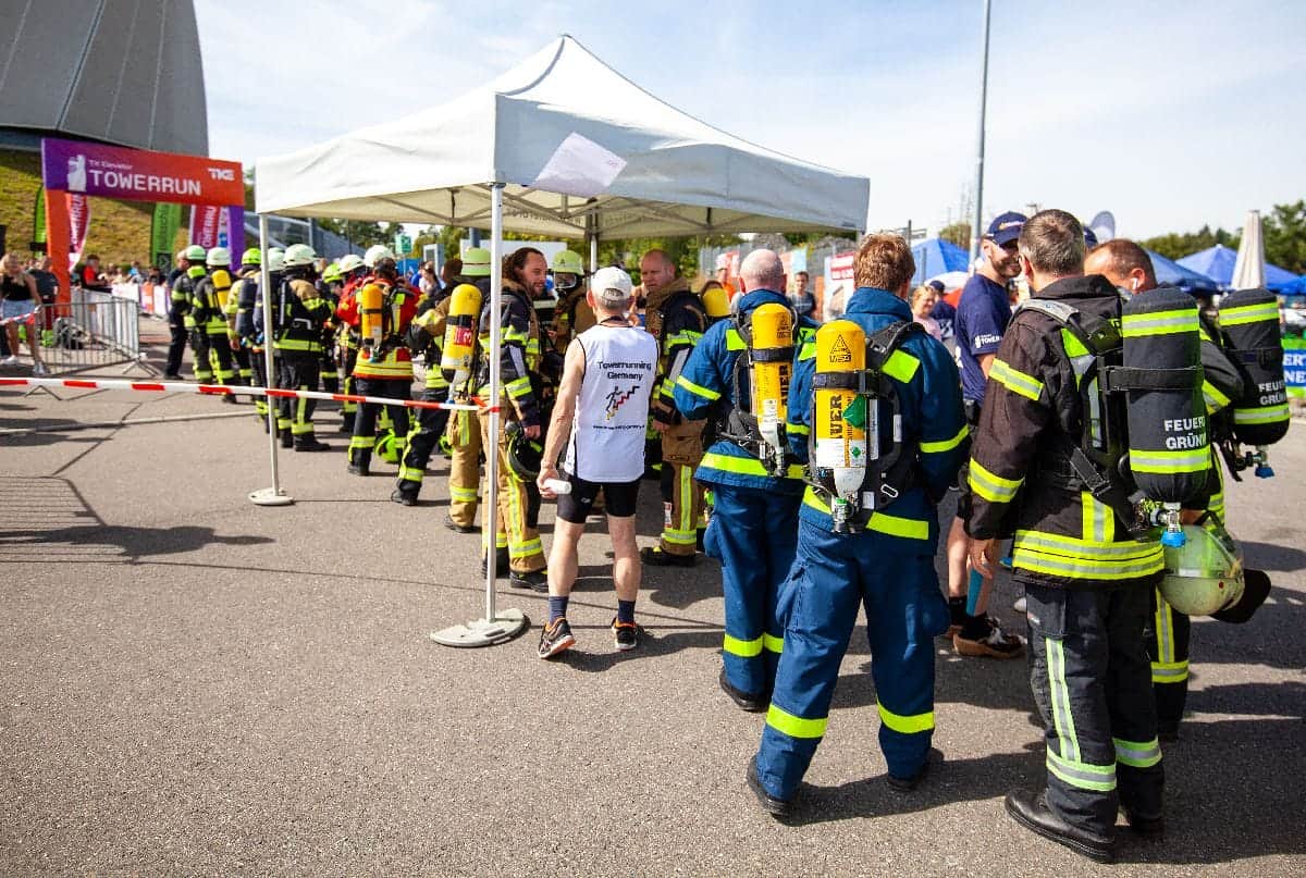 Neben den „zivilen“ Läuferinnen und Läufern rüsteten sich auch zahlreiche Feuerwehrleute für die Herausforderung. Etwas weniger als die Hälfte der Starter im Testturm nahmen an den Feuerwehr-Wettbewerben teil. Die uniformierten Retter konnten den TK Elevator Testturm jeweils als Zweierteam bezwingen – die meisten davon mit angeschlossenen Atemschutzgeräten und einem Gesamtgewicht an Ausrüstung von rund 25 Kilogramm. Die mit Abstand anstrengendste Form, um an diesem Tag den „Gipfel“ in 232 Metern Höhe zu erreichen, ergab auch ein imposantes Bild für die Zuschauer, die zur vierten Auflage kamen.