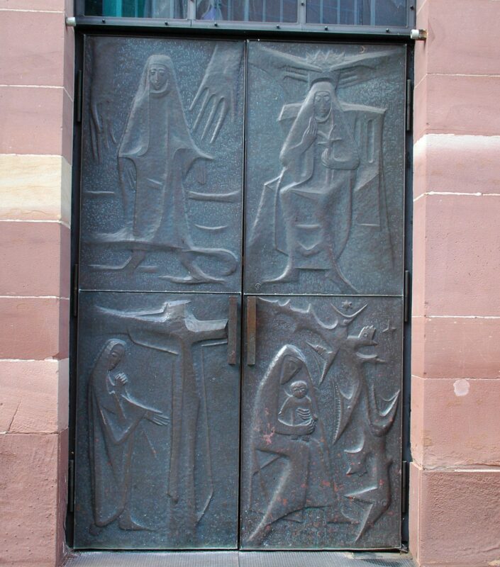 Peter Faller erläutert in seinem einstündigen Rundgang Details des Kunstschaffens des Bildhauers Erich Hauser, der in den Jahren 1952 bis 1959 hier in Schramberg den Grundstock für seine Karriere schuf. In dieser Zeit entstanden auch die bemerkenswerten Kirchenportale. Abgebildet sind dort kupfergetriebene Reliefs, Szenen aus dem Leben Mariens.