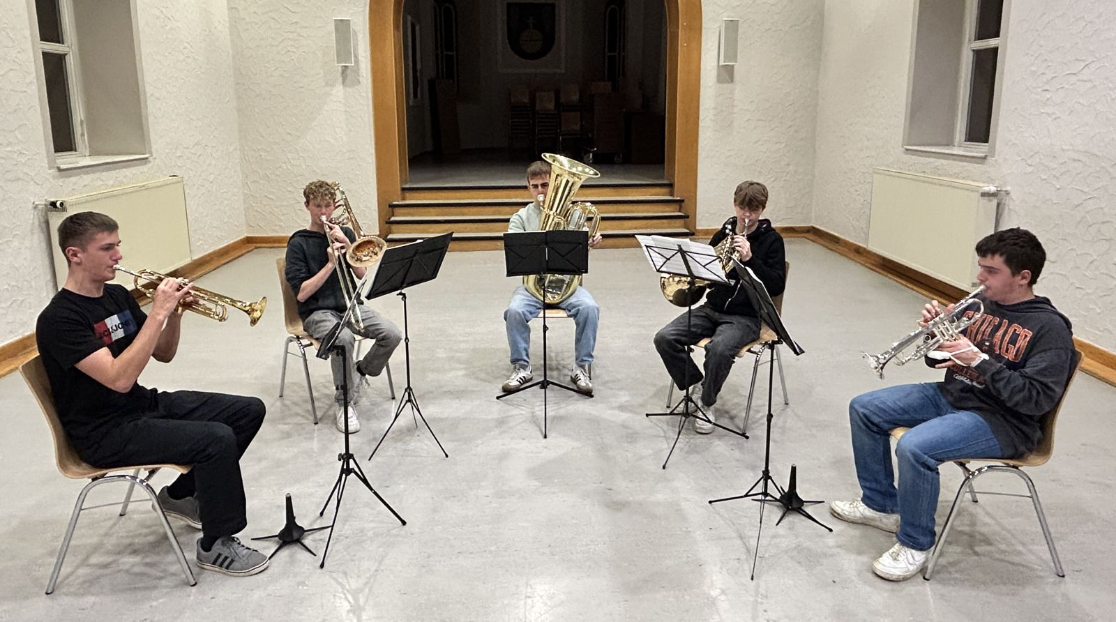 - sowie ein Blechbläserquintett mit Trompeten, Horn, Posaune und Tuba unter der Leitung von Daniel Weißer.