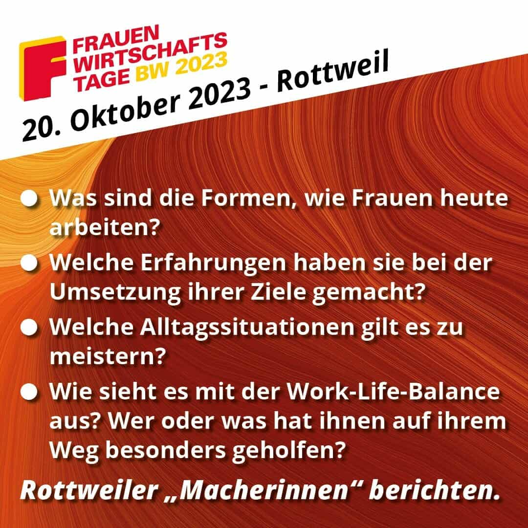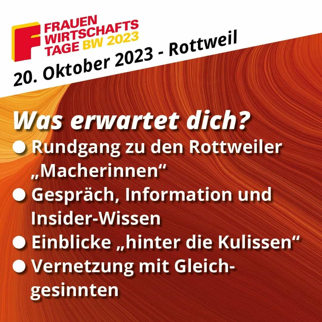 Weitere Informationen: www.frauenwirtschaftstage.de und bei Bettina Weigl, Wirtschaftsförderung der Stadt Rottweil, Telefon 0741/494-239, E-Mail:Bettina.Weigl@Rottweil.de.