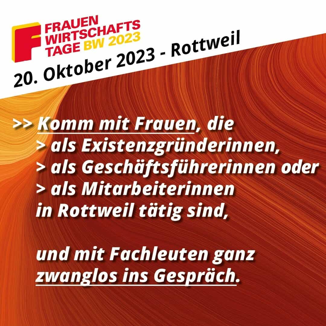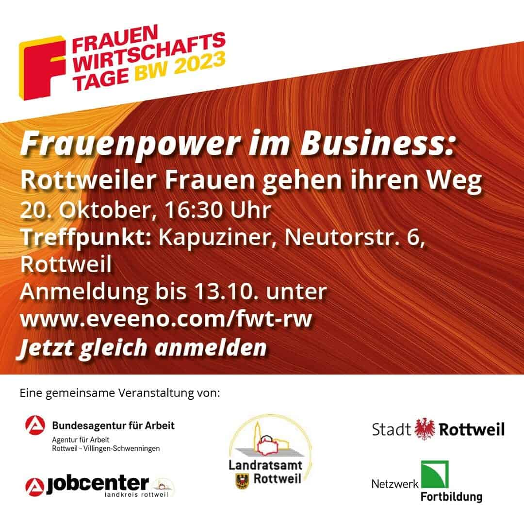 Rottweils Innenstadt ist geprägt durch kleine Geschäfte – viele spannende Geschäftsideen werden dort von Frauen umgesetzt. Bei den diesjährigen Rottweiler Frauenwirtschaftstagen kommen die Besucherinnen und Besucher mit Unternehmerinnen und Fachleuten ins Gespräch und können das Informationsangebot der beteiligten Veranstalter und der Unternehmerinnen nutzen. Der Frauenwirtschaftstag in Rottweil wird organisiert von der Stadt Rottweil, der Agentur für Arbeit Rottweil – Villingen-Schwenningen, dem Jobcenter Landkreis Rottweil, dem Landratsamt Rottweil und dem Regionalbüro für berufliche Fortbildung Schwarzwald-Baar-Heuberg.