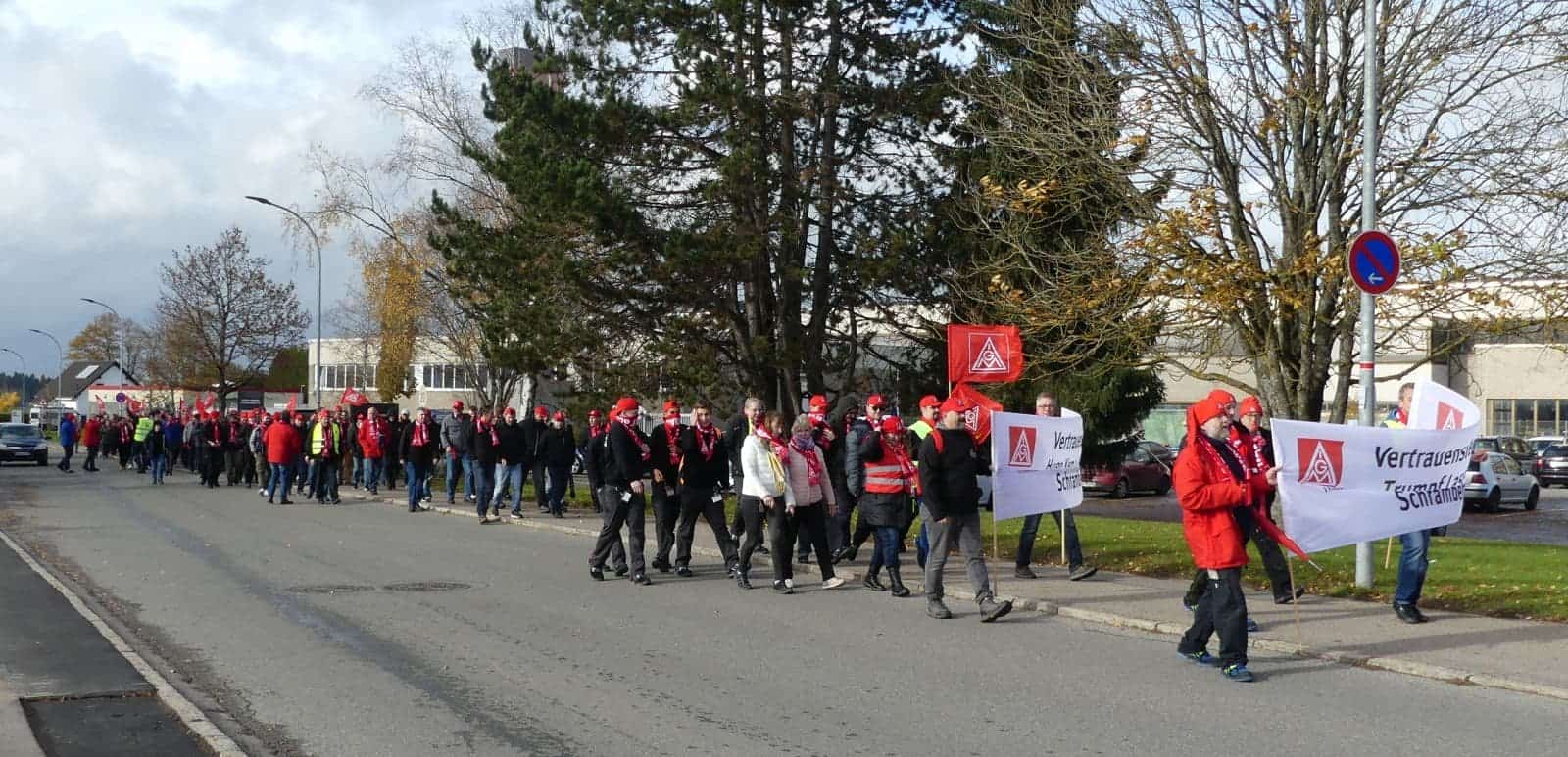 Am frühen Donnerstagnachmittag haben sich etwa 250 Kolleginnen und Kollegen aus Sulgener Betrieben, aber auch aus Aichhalden und Dunningen zu einem Warnstreik bei der Radlerhalle versammelt.