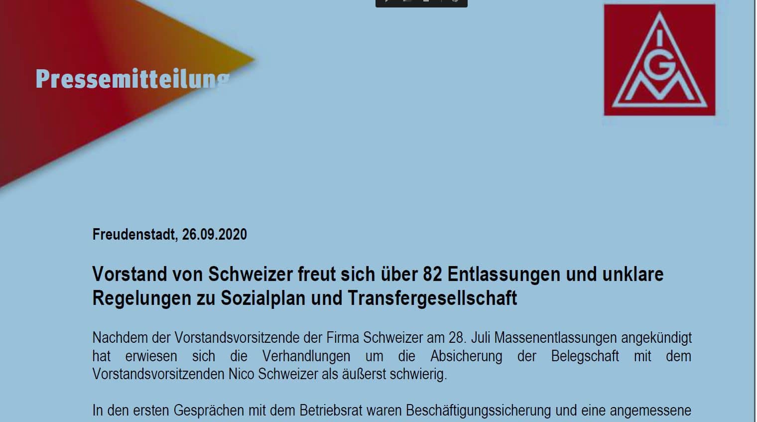 Nachdem der Vorstandsvorsitzende der Firma Schweizer am 28. Juli Massenentlassungen angekündigt hat, erwiesen sich die Verhandlungen um die Absicherung der Belegschaft mit dem Vorstandsvorsitzenden Nico Schweizer als äußerst schwierig.