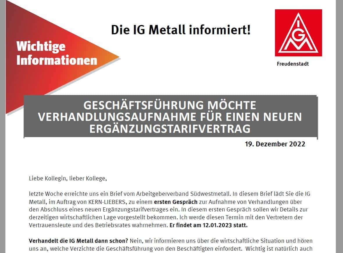 Der zweite Bevollmächtigte Georg Faigle schreibt, letzte Woche habe die IG Metall Freudenstadt ein Brief vom Arbeitgeberverband Südwestmetall erreicht. Darin lade Südwestmetall die IG Metall im Auftrag von Kern-Liebers „zu einem ersten Gespräch zur Aufnahme von Verhandlungen über den Abschluss eines neuen Ergänzungstarifvertrages ein“