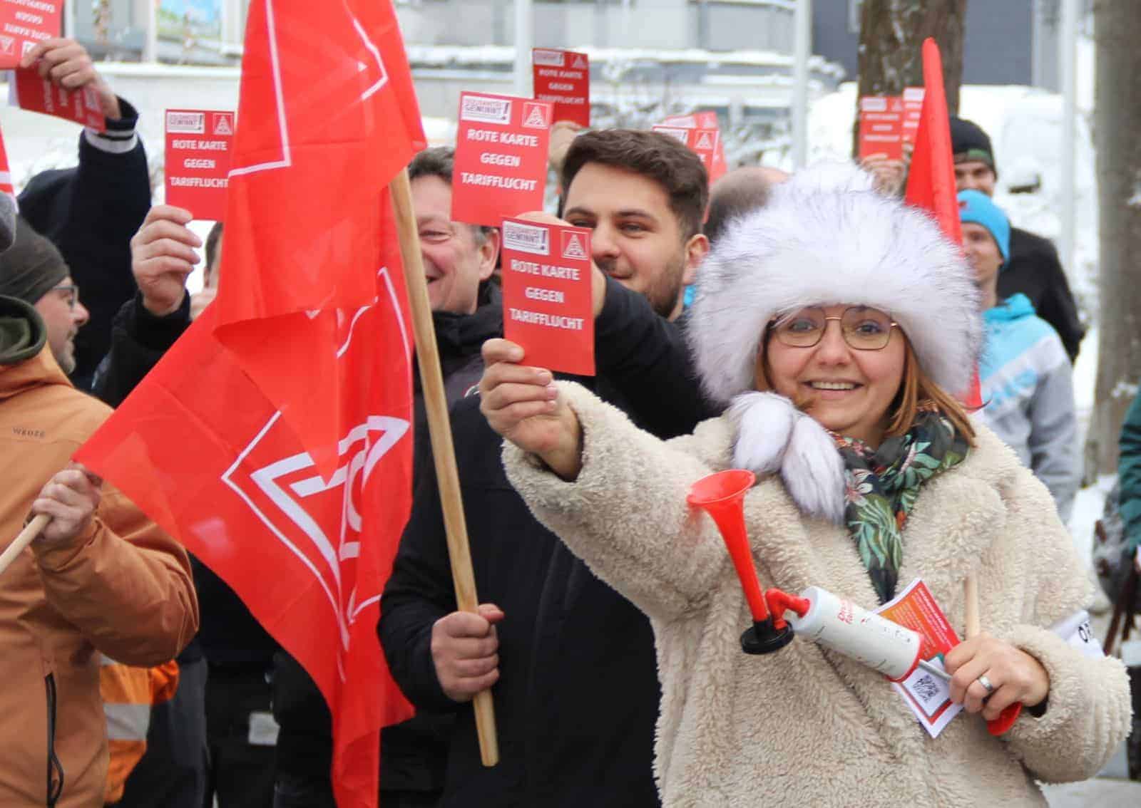Bei Saxonia in Göppingen sind am Donnerstag die Beschäftigten in der Mittagspause auf die Straße gegangen. Um 5 vor zwölf haben sie der Geschäftsleitung die „Rote Karte“ gezeigt. Die Belegschaft sei nicht bereit, „den Arbeitgeberverbandsaustritt widerstandslos hinzunehmen“, betont Manuel Schäfer von der IG Metall.