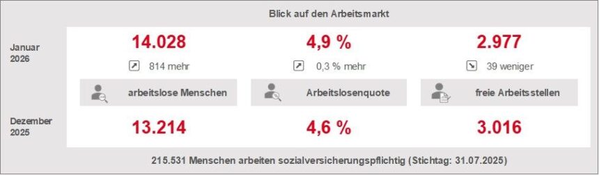 Im Januar waren 14.028 Personen arbeitslos gemeldet, 814 Personen mehr (6,2 Prozent) als im Dezember und 601 Personen (4,5 Prozent) mehr als vor einem Jahr. Die Arbeitslosenquote stieg laut Agentur für Arbeit um 0,3 Prozentpunkte auf 4,9 Prozent.