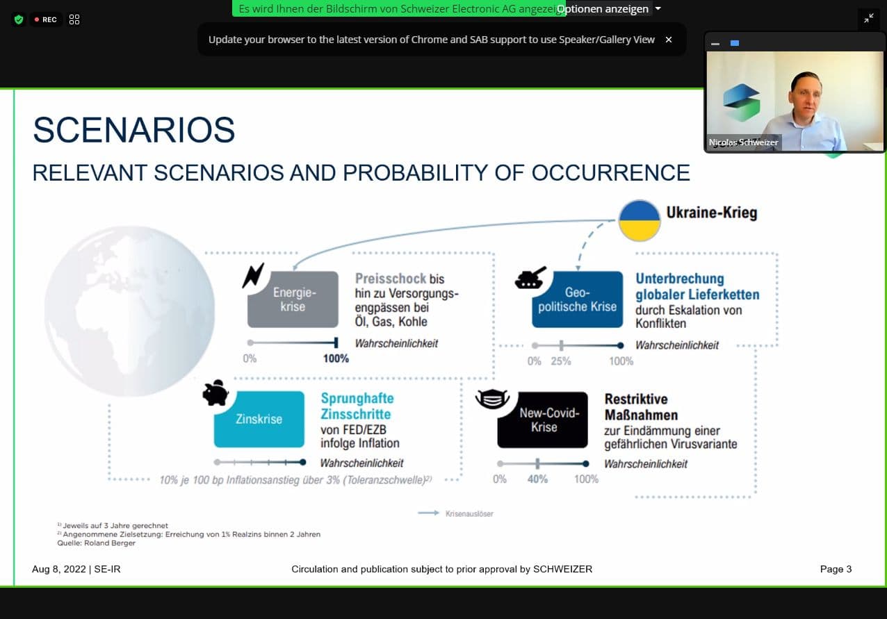 Per Videokonferenz berichtete Schweizer von den großen Problemen dieser Tage: Unterbrochene Lieferketten und Energiekrise: „Der Preisschock ist da“, so Schweizer. Dann die Eskalation der geopolitischen Krisen, Zinserhöhungen der Zentralbanken und die nach wie vor andauernde Pandemie.