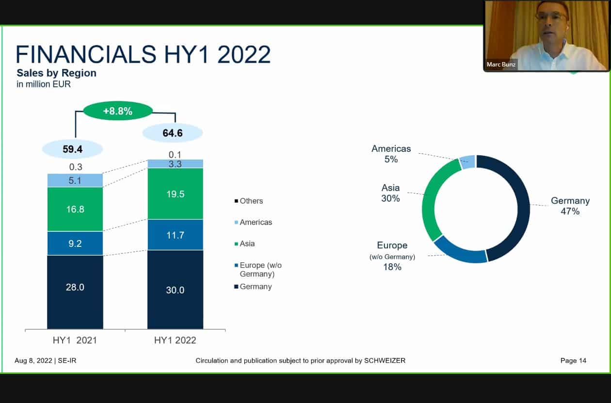 Aus einem chinesischen Quarantäne-Hotel zugeschaltet war Finanzchef Bunz. Er sei auf dem Weg ins dortige Zweigwerk. Bunz berichtete von den auf knapp 65 Millionen Euro gestiegenen Umsatzzahlen. Davon erwirtschafte man etwa zwei Drittel in Deutschland und Europa und 30 Prozent in Asien. Der Automotive-Anteil sei von knapp drei Viertel auf etwa zwei Drittel zurückgegangen. Seit 2020 sei der Umsatz deutlich gestiegen. Das zeige: „Die Kunden stehen weiterhin zu Schweizer.“