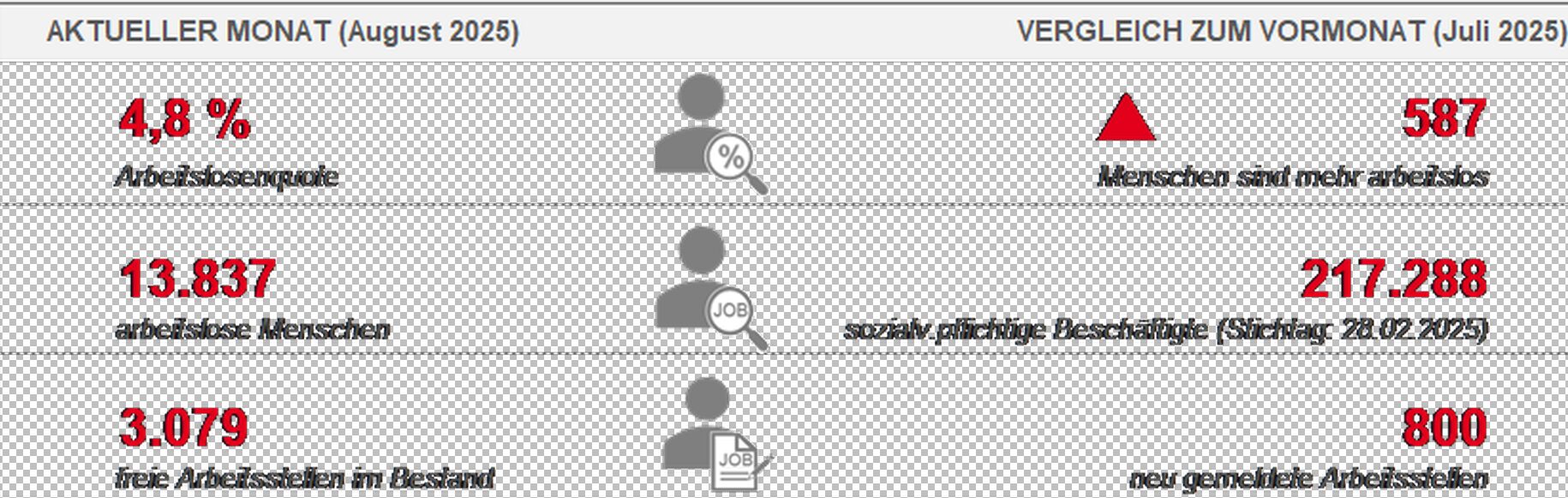 Im Agenturbezirk waren im August 13.837 Personen arbeitslos gemeldet. Die Zahl der Arbeitslosen ist seit dem Beginn der Sommerferien weiter gestiegen: 587 Personen mehr als im Vormonat (plus 4,4 Prozent) und 1143 Personen mehr als vor einem Jahr (plus 9 Prozent). Die Arbeitslosenquote stieg auf 4,8 Prozent. Das berichtet die Agentur für Arbeit in einer Pressemitteilung.
